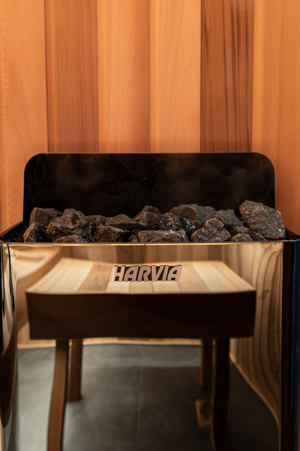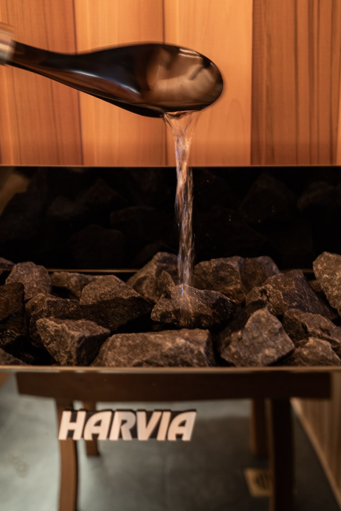 Heating is handled by a Harvia The Wall unit, delivering a traditional sauna experience with a clean, modern aesthetic that complements the cedar interior.