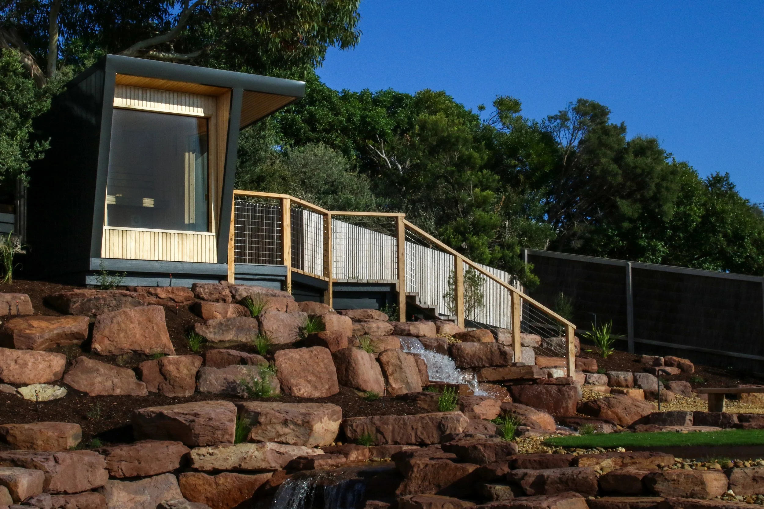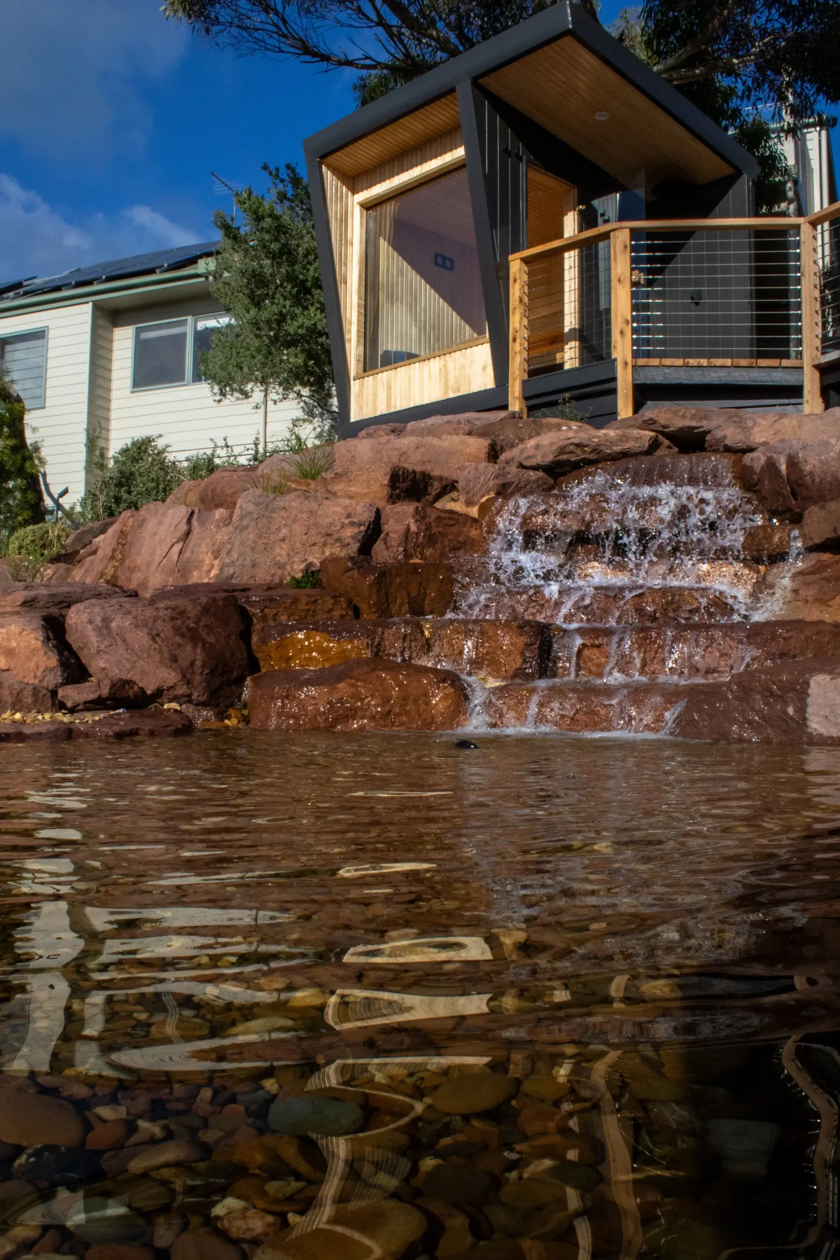 We utilised our signature Horizon model as the architectural anchor. The clean, modern lines of the structure provide a deliberate contrast to the organic, irregular forms of the stone and water, creating a striking visual balance.