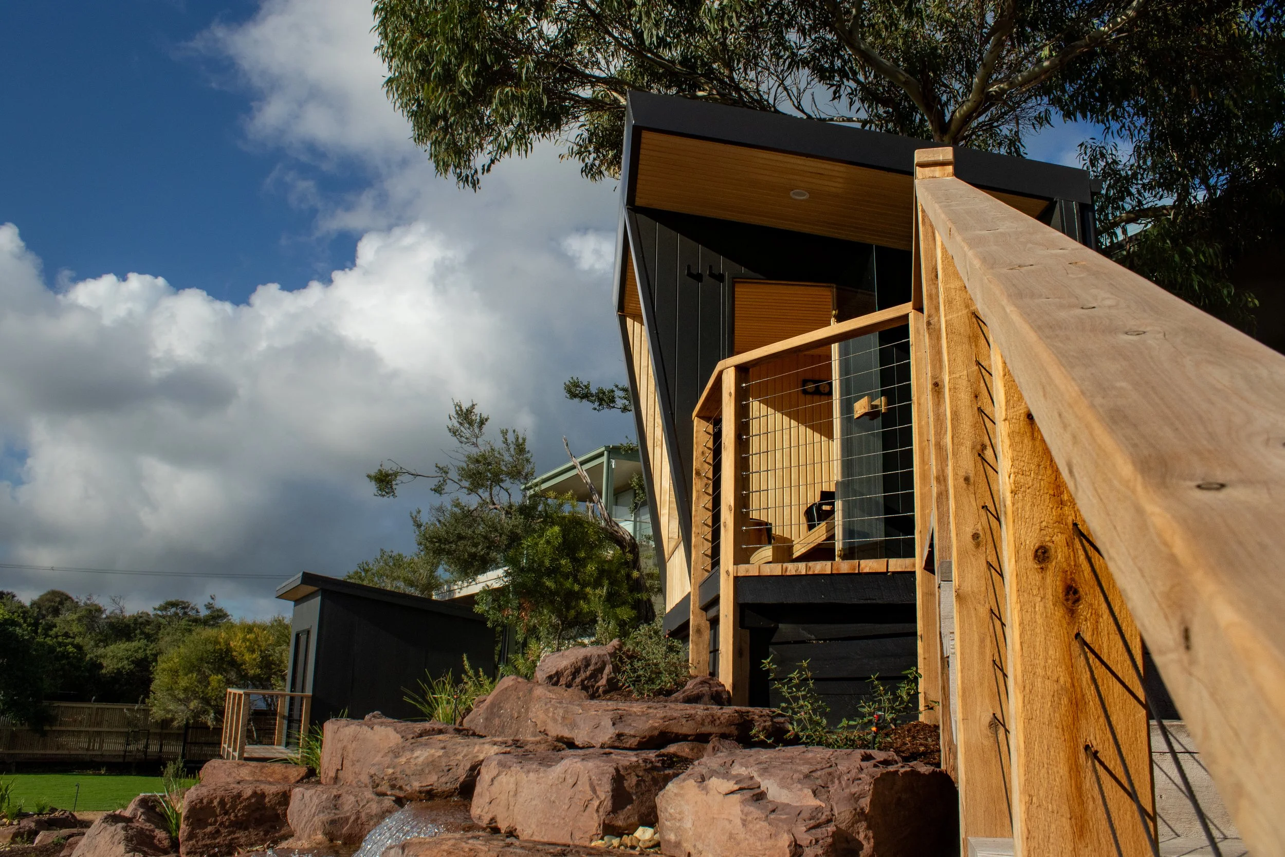 This Sorrento features our signature Horizon Sauna nestled beside a natural stone waterfall and rock-lined pool. It is a design that seamlessly blends luxury craftsmanship with the raw beauty of its coastal surroundings, creating a contrast between modern architectural lines and organic landscape elements.